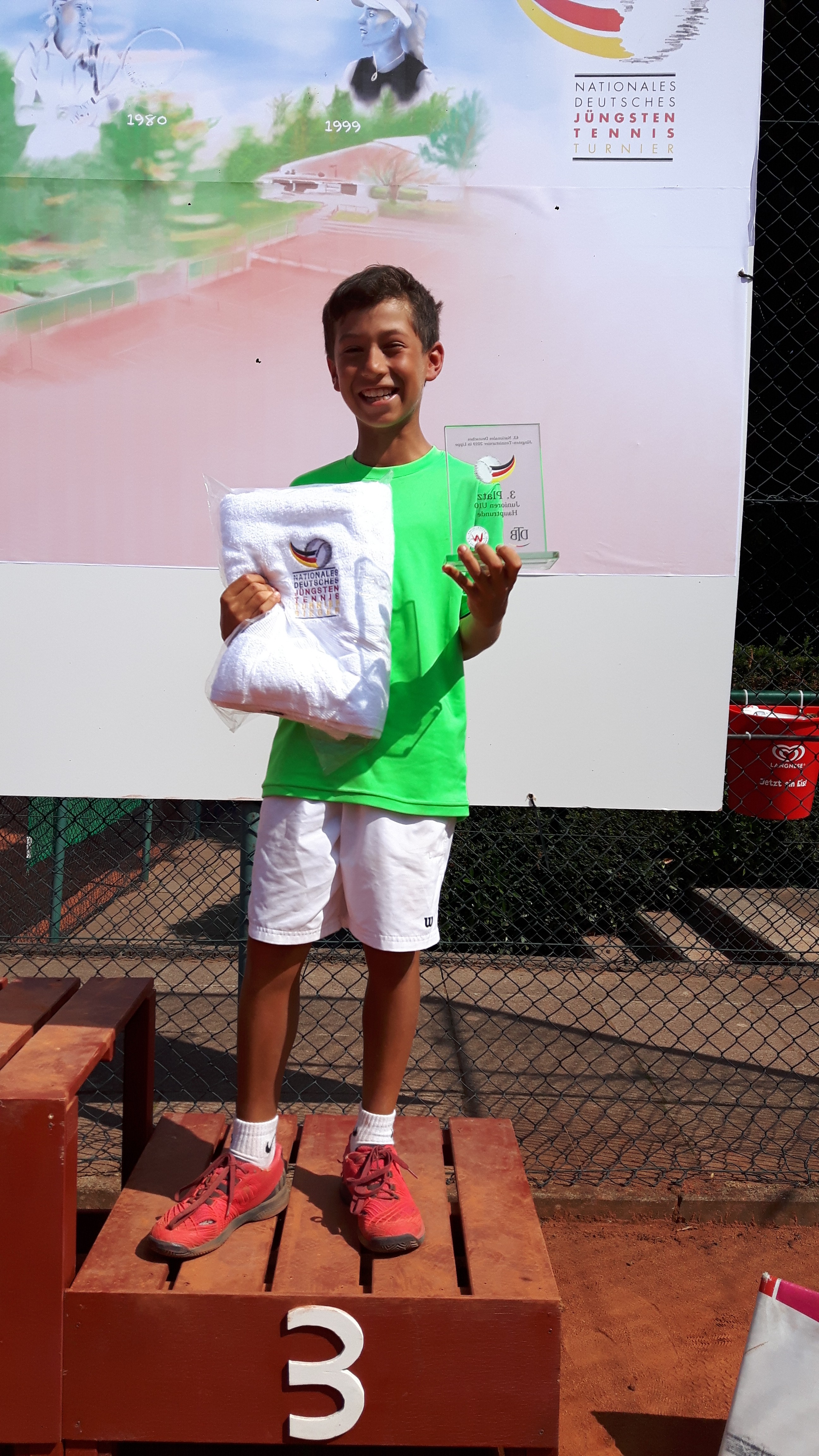 Im Halbfinale wartete dann mit Ilian Mechball vom Netzballverein Niederrhein ein großer Spieler mit wuchtigen Grundlinienschlägen, mit denen er Ontiveros immer wieder unter Druck setzte. Der Penzberger kämpfte und erspielte sich durchaus seine Chancen, verlor aber dann etwas unglücklich den ersten Satz mit 6:7 im Tiebreak. Im zweiten Satz zog Mechball schnell mit 5:1 davon, doch Ontiveros legte nochmal alle Energie in das Match und holte Spiel für Spiel bis zum 4:5 Anschluss auf. Er schaffte die Wende aber nicht mehr und zog letztlich mit 6:7 4:6 den Kürzeren gegen den späteren Turniersieger. Nach der ersten Enttäuschung überwog bei der Siegerehrung dann aber die Freude als Dritter auf dem Podium bei den deutschen Jüngstenmeisterschaften zu stehen.